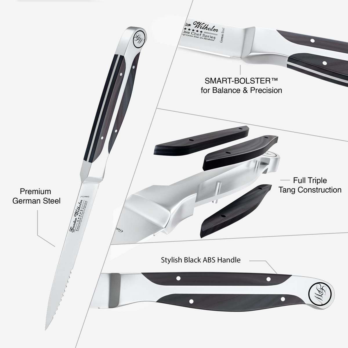 Only need a few pieces of professional cutlery to update your collection? Invest in our 7-piece German steel collection of knives with well-balanced black ABS handles.